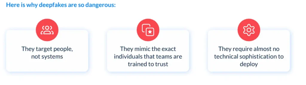 L’impatto potenziale è notevole e può includere frodi finanziarie, trasferimenti non autorizzati, danni alla reputazione, sanzioni normative e la validazione accidentale di false identità. Per prevenire questi rischi, le aziende dovrebbero applicare controlli finanziari chiari. Ad esempio, richiedere una conferma via SMS dal CFO prima di trasferire i fondi, perché l’approvazione verbale non può più essere sufficiente. Le organizzazioni possono anche acquistare strumenti progettati per rilevare i deepfake prima che causino danni.